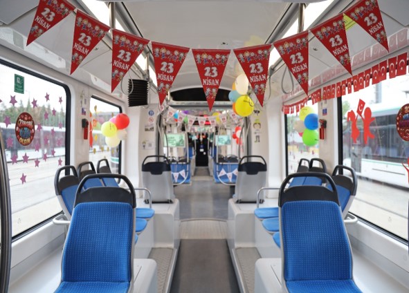 23 Nisan Coşkusu Tramvayda minik ellerin hazırladığı rengarenk süslemelerle tramvaylarımız bayram havasına büründü. Ulaşımpark olarak çocuklarımızın sevincine ortak olduk, bu özel günü birlikte kutladık.