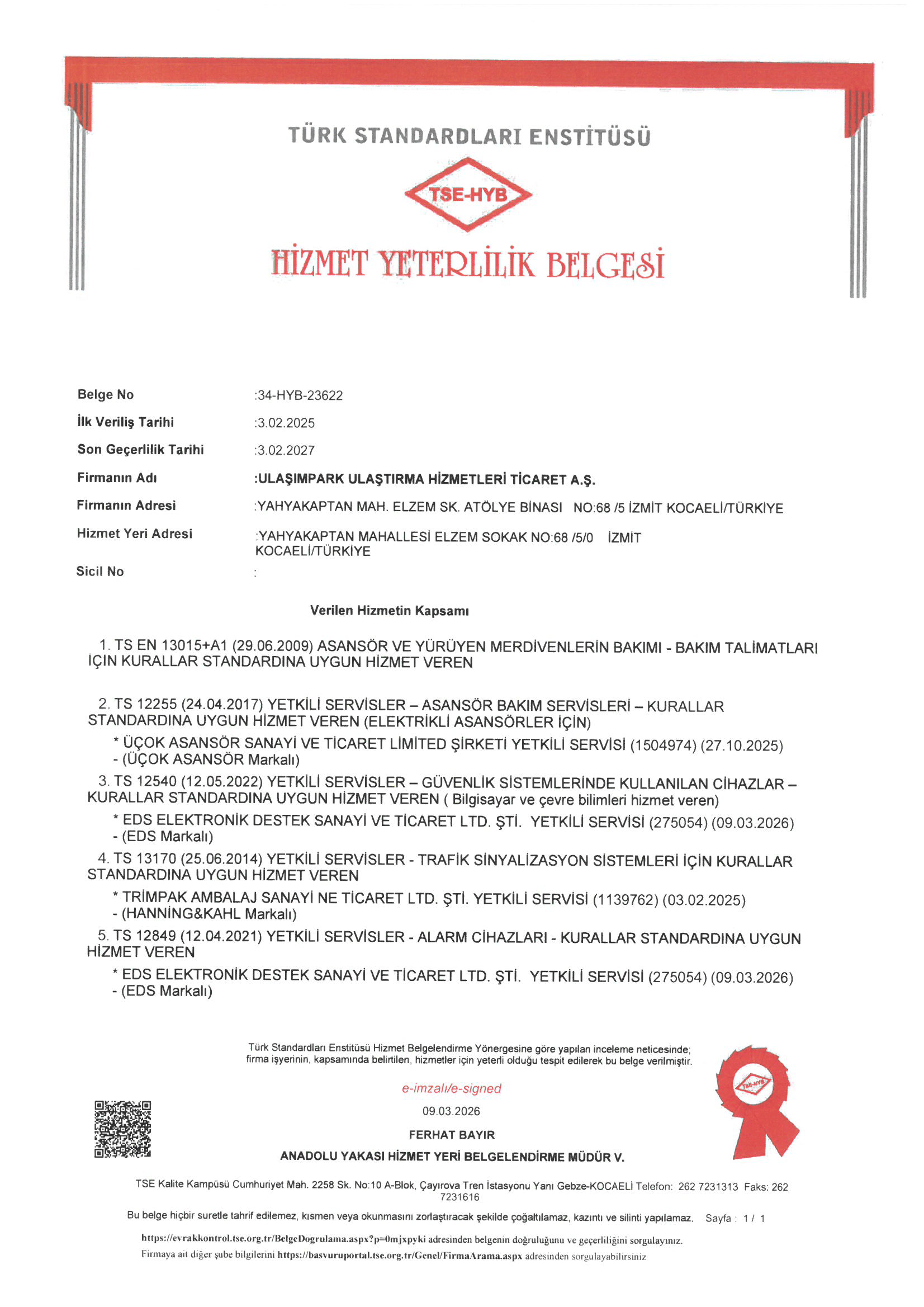 TS 13170 TRAFİK SİNYALİZASYON SİSTEMLERİ , TS EN 13015+A1 ASANSÖR VE YÜRÜYEN MERDİVENLERİN BAKIMI, TS 12255 ASANSÖR BAKIM SERVİSLERİ, TS 12540 GÜVENLİK SİSTEMLERİ, TS 12849 ALARM CİHAZLARI